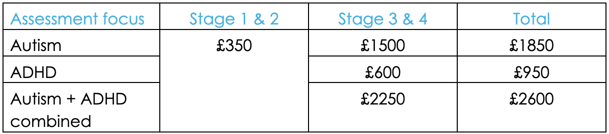 Our fees vary based on the focus of the assessment. We can offer assessments for Autism, ADHD or Autism + ADHD combined.